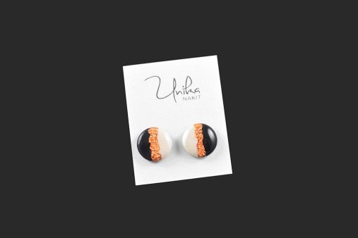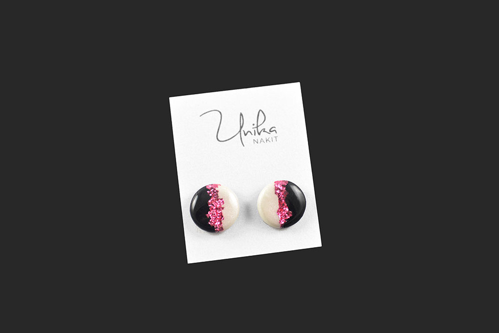 Unikastični uhani Glass oddajajo prav poseben lesk, saj so izdelani s teksturo, ki spominja na steklo. Navdušujejo s brezčasno črnino in pearl belo barvo, ki ju loči še ena posebna tekstura v izbrani elegantni barvi. Ta se ob svetlobi še dodatno zablešči. Uhani so na pikeca. V živo so uhani še lepši, kot na fotografijah.