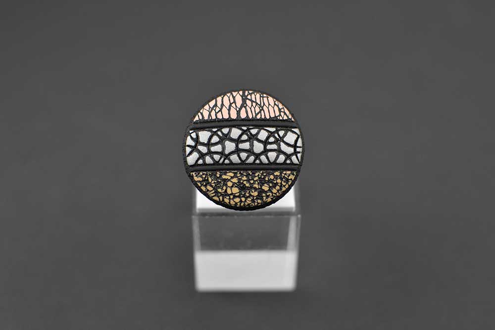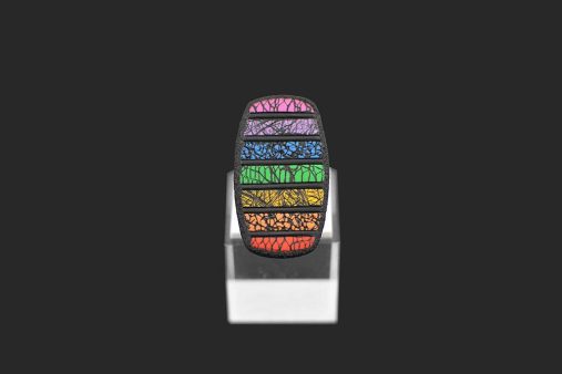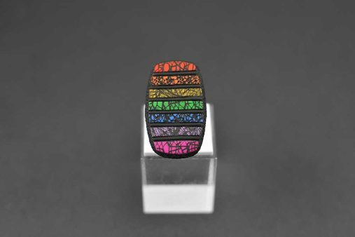 Ročno izdelan prstan Mor je oblikovan z mozaično tehniko, kjer se različni privlačni vzorci s čudovito teksturo med seboj imenitno dopolnjujejo.