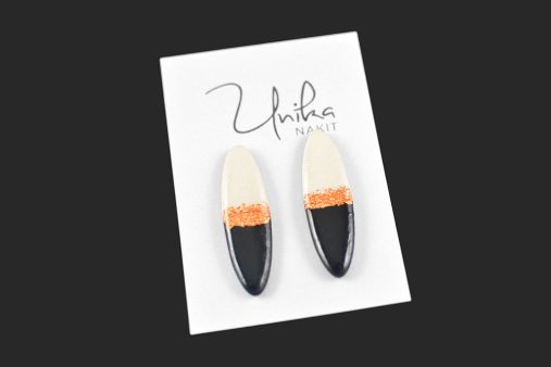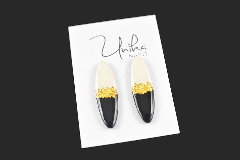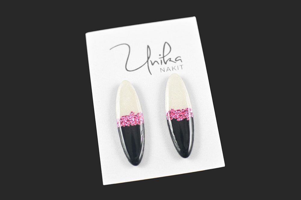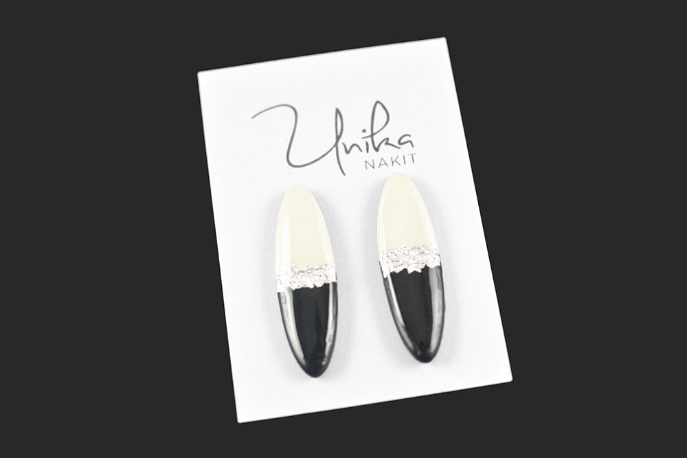 Unikastični uhani Glass oddajajo prav poseben lesk, saj so izdelani s teksturo, ki spominja na steklo. Navdušujejo s brezčasno črnino in pearl belo barvo, ki ju loči še ena posebna tekstura v izbrani elegantni barvi. Ta se ob svetlobi še dodatno zablešči. Uhani so na pikeca in lepo obvisijo. V živo so uhani še lepši, kot na fotografijah.