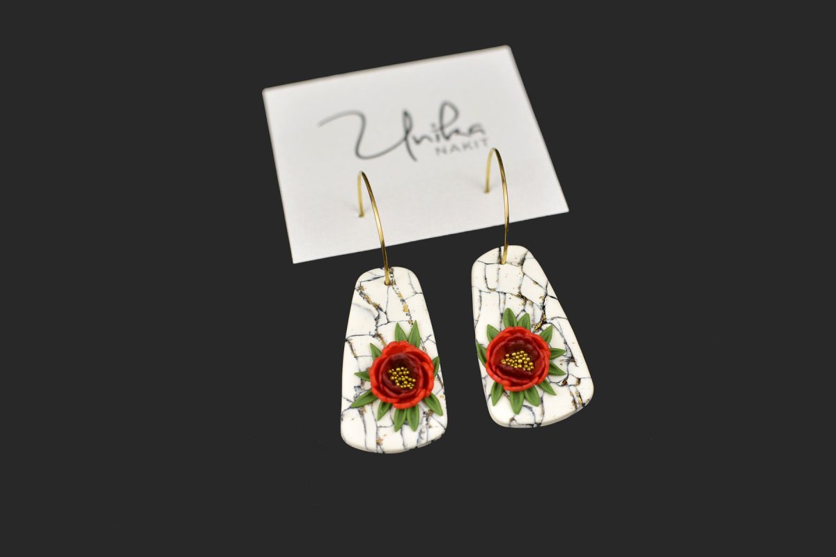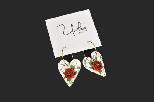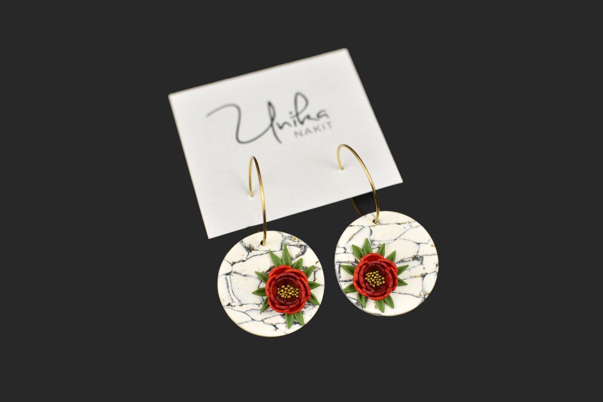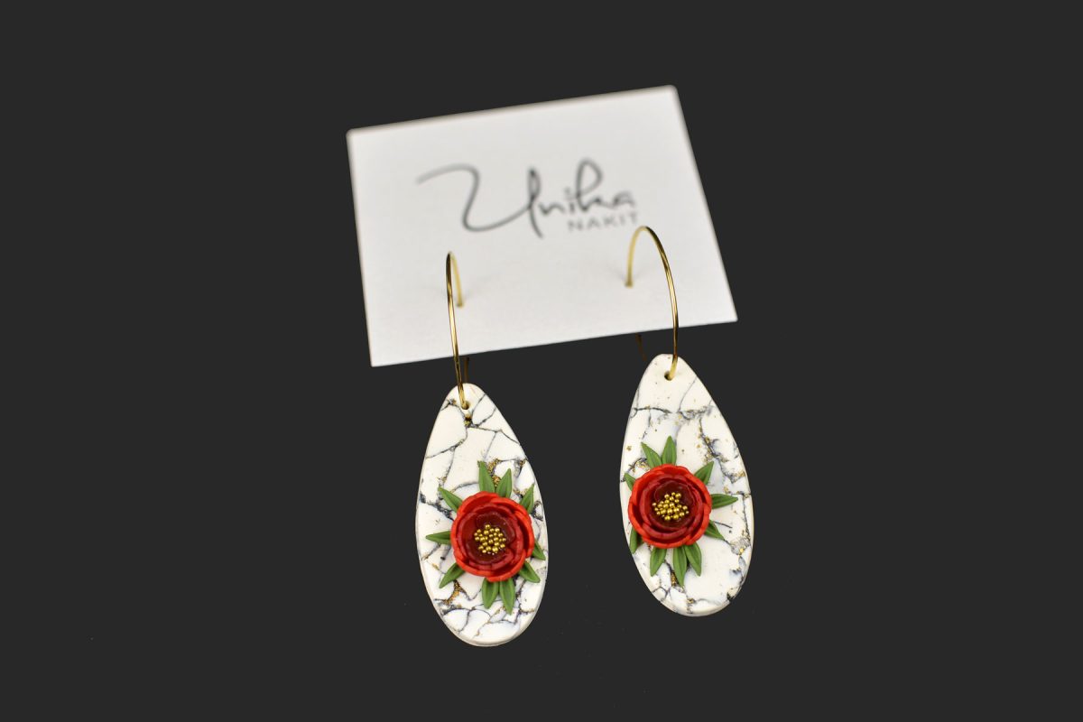 Elegantni in izraziti – kot droben košček umetnosti, ki oživi tvoj stil. Ročno izdelan rdeč cvet s središčem posutim z drobnimi zlatimi kroglicami zasije na nevtralni podlagi v videzu marmorja. Pod cvetom se razteza pridih zelenja, ki doda naravno svežino. Zlati krog (nastavek) na ušesu poskrbi za prefinjen videz. Lahkotni, Unikastični in ustvarjeni, da očarajo.